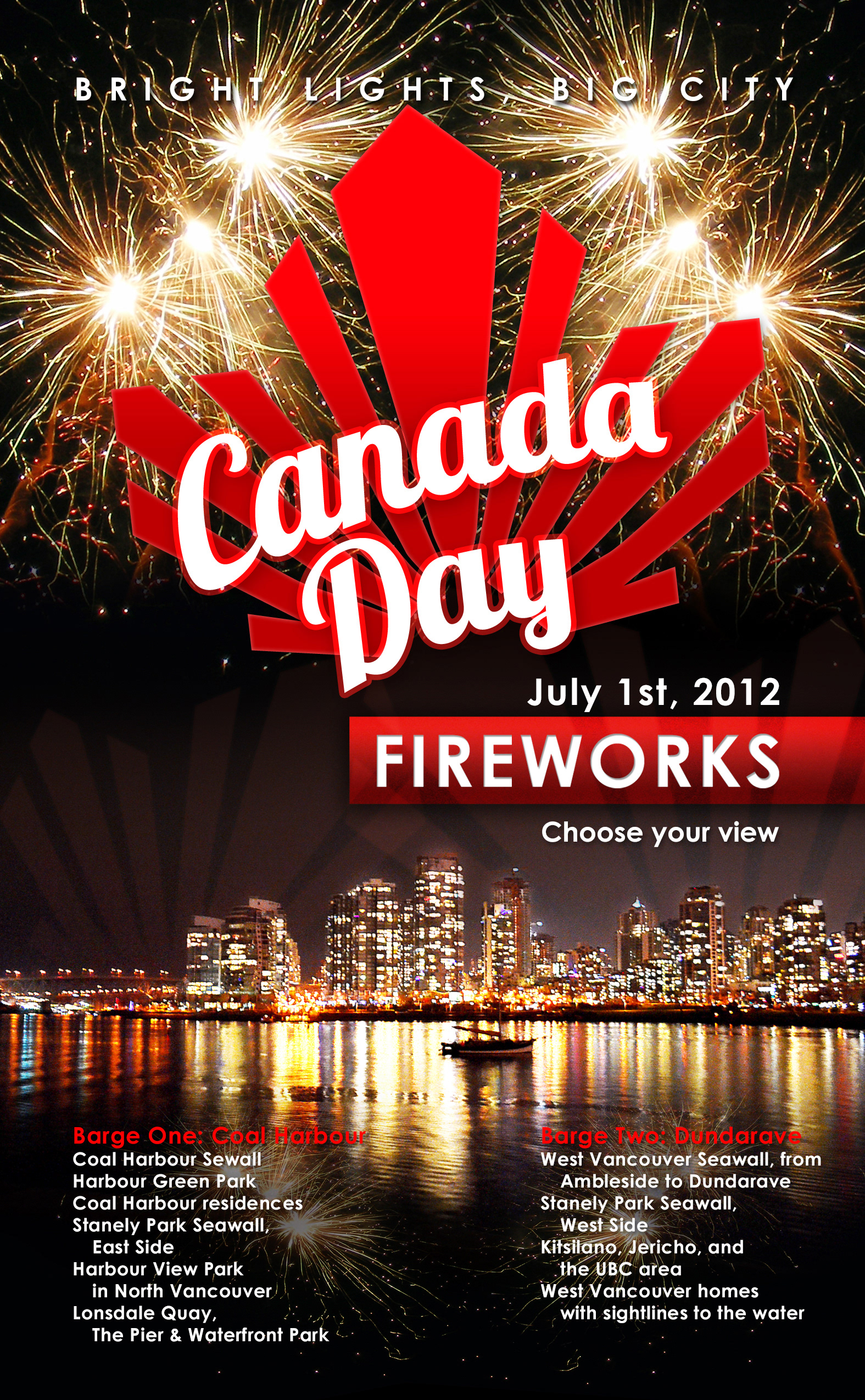 An informational poster about Canada Day in downtown Vancouver, B.C. and where you can go to see the fireworks.